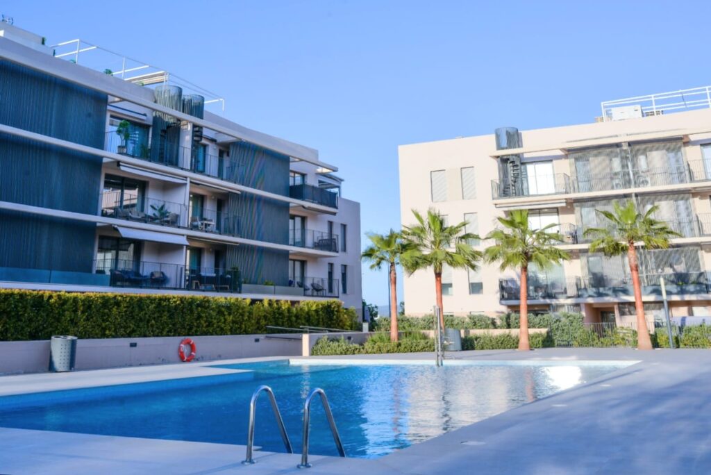 Modernes Apartment in Nova Santa Ponsa mit zwei Schlafzimmern, zwei Bädern, großer Terrasse und herrlichem Meerblick. Ruhige Wohnanlage mit Pool, Garten und Grillplatz, inklusive Außenstellplatz.
